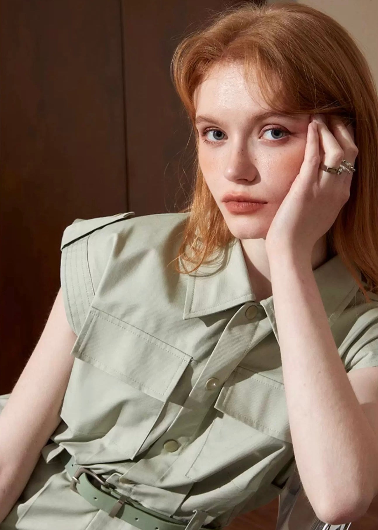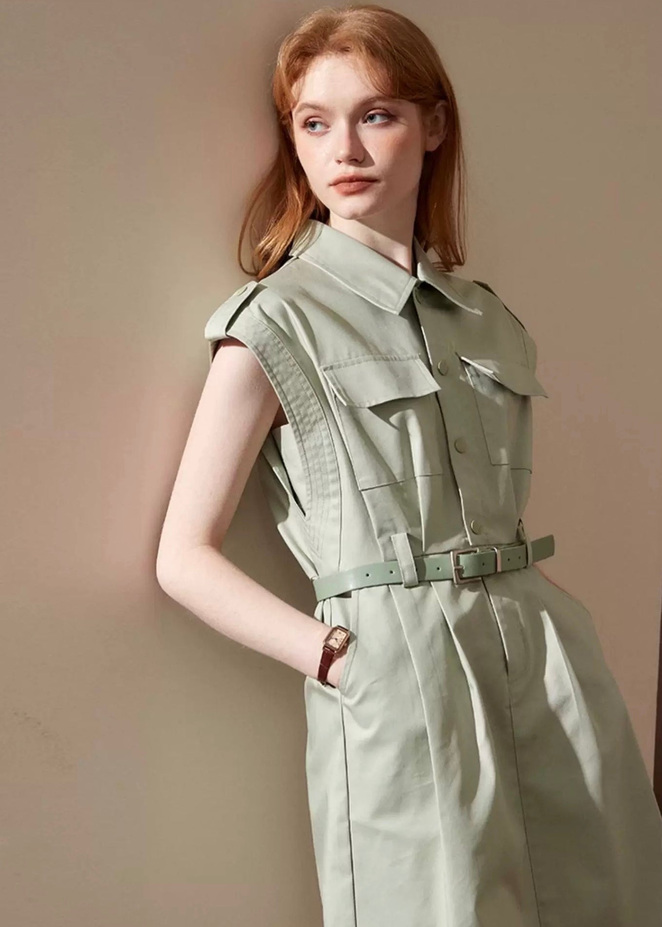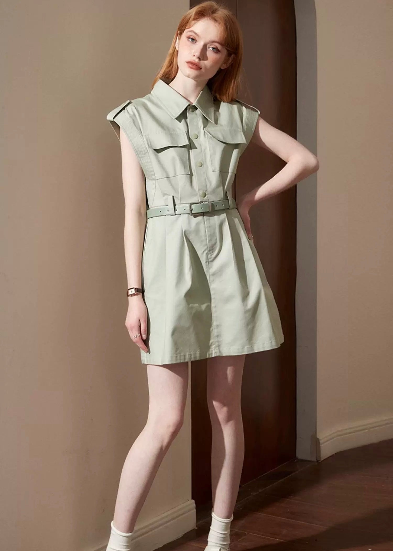 肩の立体感あるフラップディテールと、同色ベルトがウエストを引き締めスタイルアップを叶えます。